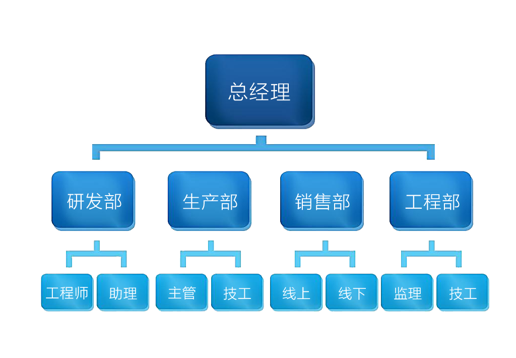 公司主要分為四大部門:研發部、生產部、銷售部和工程部。最高權利機構:總經理主要負責公司的經營決策、公司制度的審批以及人員聘用等方面的重大決策。以下是公司組織結構圖。